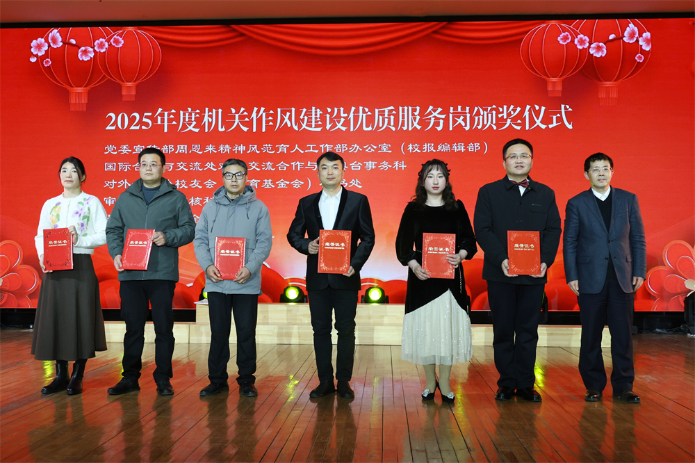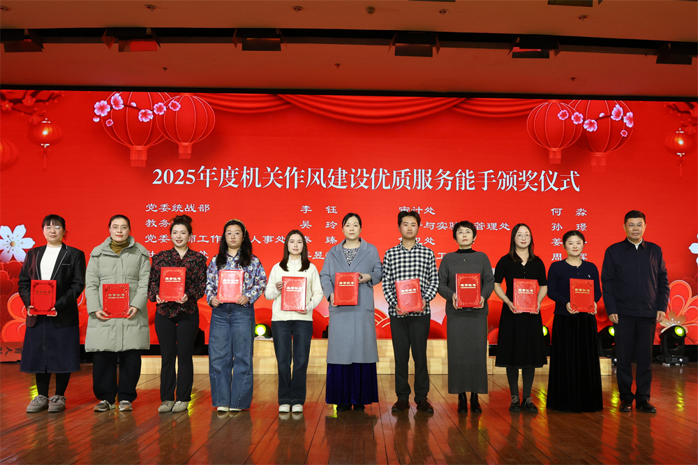 副校长赖海燕致辞。她充分肯定一年来机关同志们辛勤耕耘、无私奉献,为学校各项事业高质量发展做出的贡献。她希望机关同志们在新的一年筑牢讲政治、守初心、强党性的思想根基,扛起做表率、勇突破、开新局的时代责任,永葆接地气、通民心、务实事的工作本色,坚持目光向前、脚步向下,把师生急难愁盼作为工作出发点,以过硬机关作风为学校事业发展提供坚强有力的保障。机关党委书记王江明宣读2025年度机关作风建设优质服务能手和优质服务岗表彰决定。